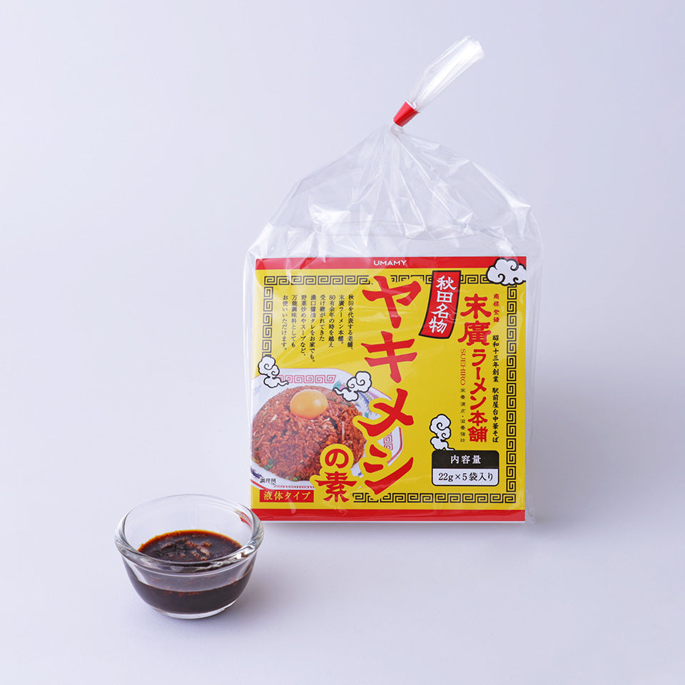 炒飯を作る際に加えるだけで、「末廣ラーメン本舗」の人気メニュー「ヤキメシ」の味になるタレです。真っ黒な濃口醤油が特徴の、本格的な味わい。1袋で1人前、5袋入りです。