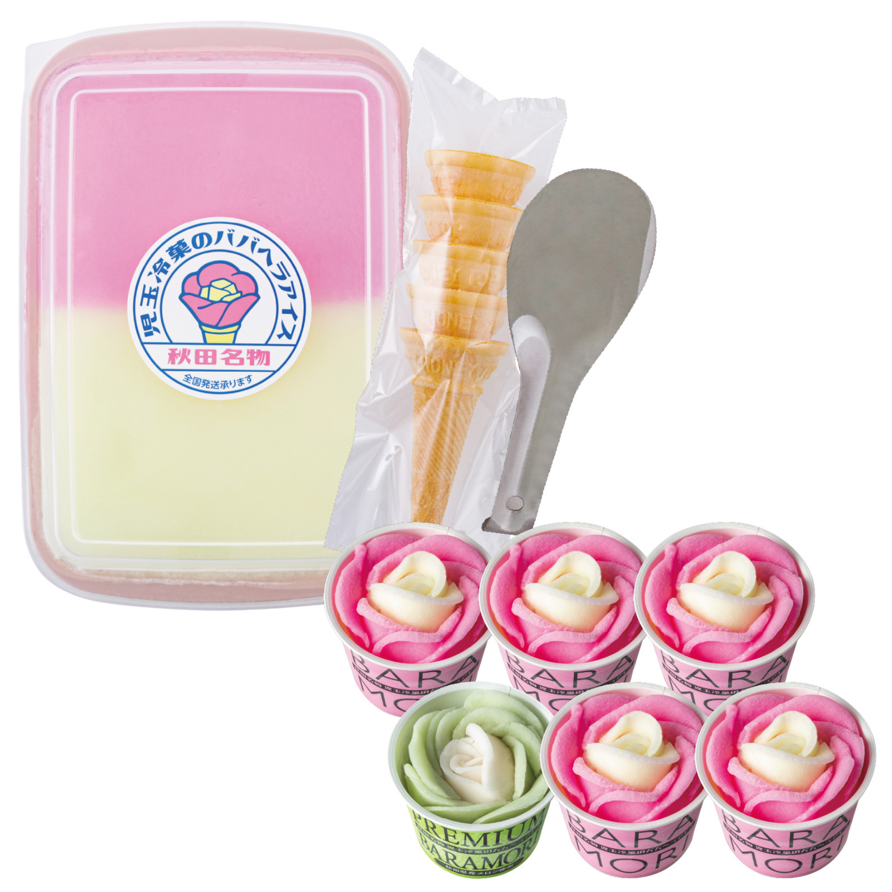 アイスタッパ1L(イチゴ&バナナ)、バラ盛りカップ100ml×6個(イチゴ&バナナ×5,プレミアムメロン×1)、コーン5個、ヘラ1個
