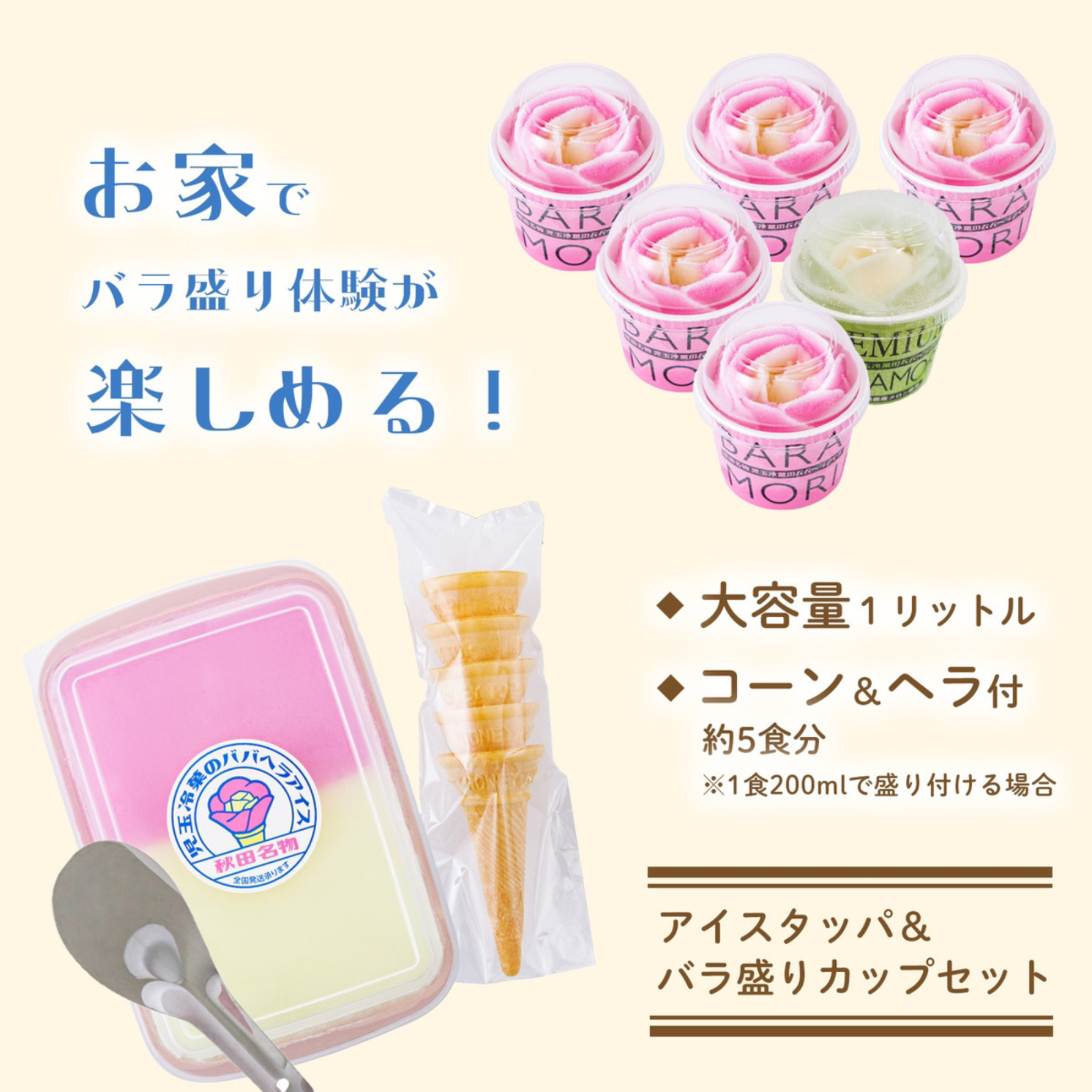 アイスタッパ、コーン5個、ヘラがセットになっているのでお家でババヘラアイスが楽しめます!綺麗なバラ盛りのカップアイスがセットになっているのでお手本としてぜひ、ご家族みなさまでお楽しみください。※カップアイスは一つ一つ手作りの為、バラ盛り部分が実物と異なる場合がございます。