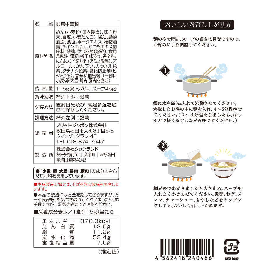 めん(⼩⻨粉(国内製造)、卵⽩粉末、⾷塩、⼩⻨たん⽩)、醤油、動物油脂、⾷塩、ポークエキス、植物油脂、チキンエキス、かつおエキス調味料、砂糖、かつお節(粉砕)、⾷用風味油、澱粉、煮干(粉砕)、⾹⾟料、にんにく/調味料(アミノ酸等)、アルコール、かんすい、カラメル色素、クチナシ色