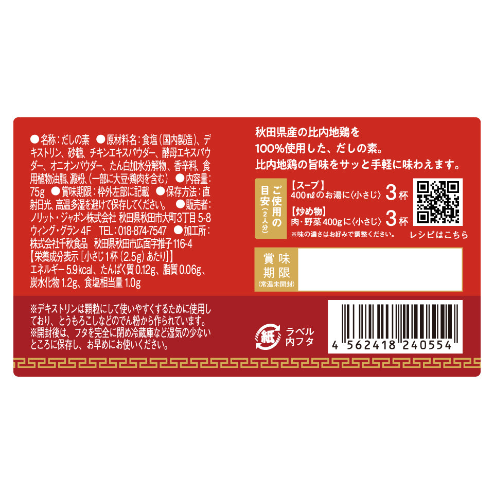 秋田県産比内地鶏を100%使用した顆粒状のガラスープの素です。化学調味料無添加で塩分相当量も抑えており、子供からお年寄りまで安心してお使いいただけます。チャーハンやナムル、スープにどうぞ。