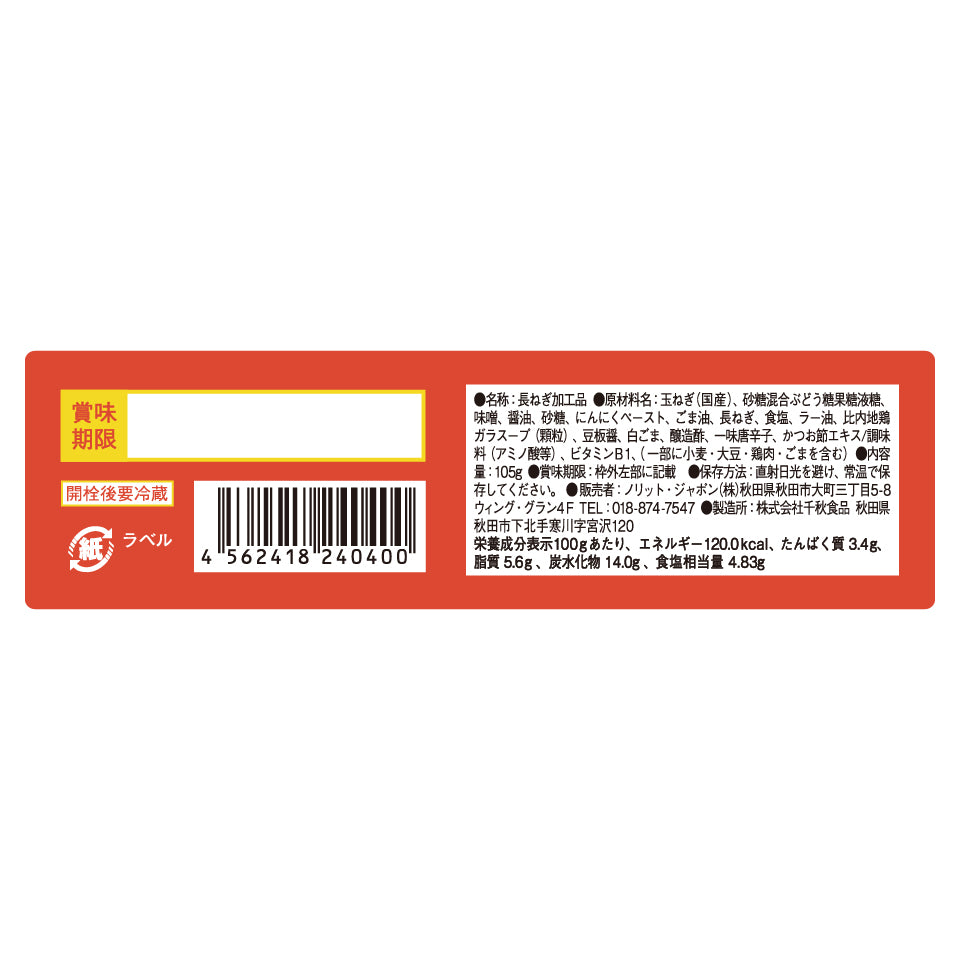 ・玉ねぎ(国産)、砂糖混合ぶどう糖果糖液糖、味噌、醤油、砂糖、にんにくペースト、ごま油、長ねぎ、食塩、ラー油、比内地鶏ガラスープ(顆粒)、豆板醤、白ごま、醸造酢、一味唐辛子、かつお節エキス/調味料(アミノ酸等)、ビタミンB1(一部に小麦・大豆・鶏肉・ごまを含む)