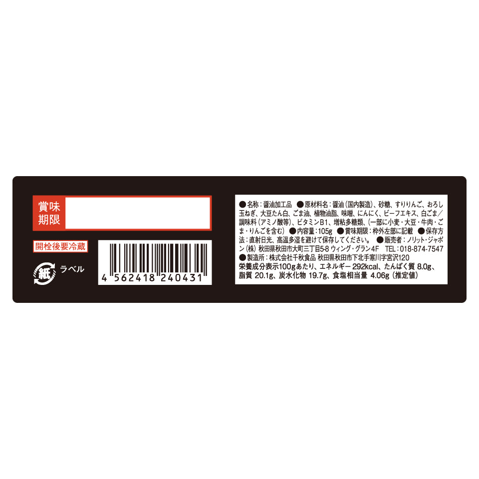 ・玉ねぎ(国産)、醤油、砂糖、みりん、ごま油、長ねぎ、食塩、にんにくペースト、比内地鶏ガラスープ(顆粒)、白ごま、香辛料、かつお節エキス/調味料(アミノ酸等)、ビタミンB1(一部に小麦・大豆・鶏肉・ごまを含む)
