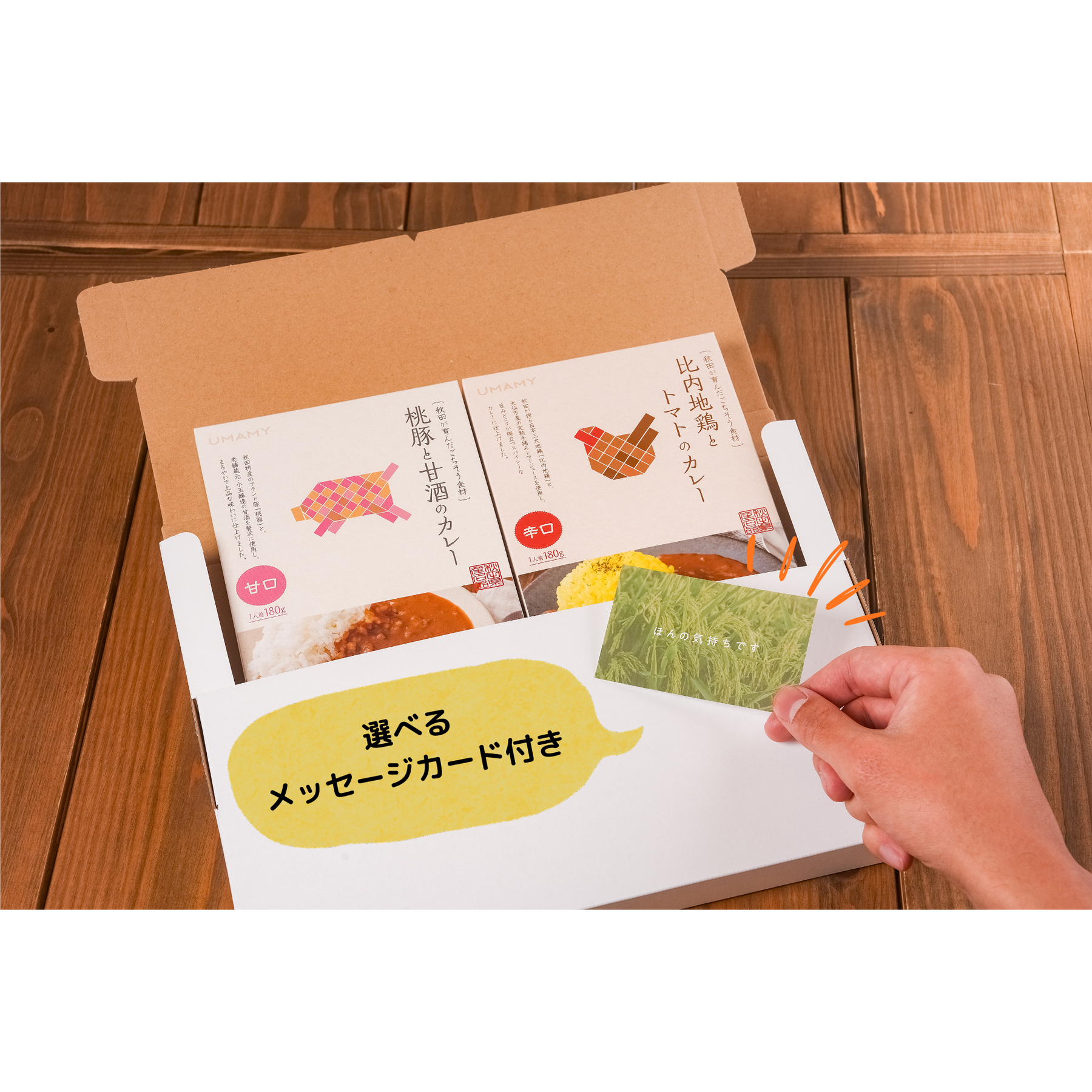 簡単調理、長期保存のレトルトカレーはプチギフトとして便利です。